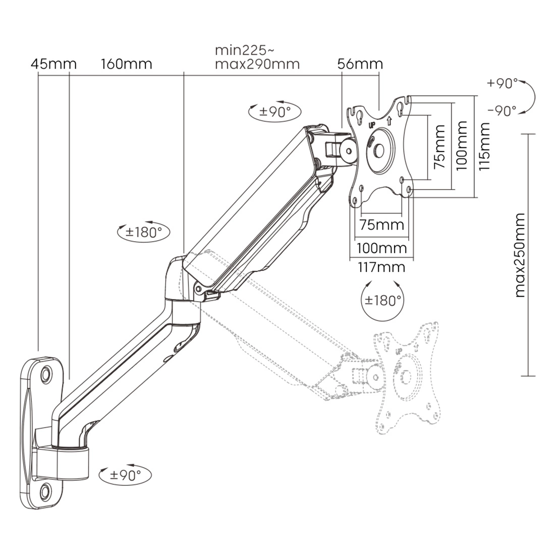 Ramię do monitora Spacetronik oferuje pełną swobodę konfiguracji. Możliwość pochylenia w zakresie +90°~-90°, a zakres obrotu oraz rotacji ekranu to również +90°~-90°. Maksymalne wydłużenie ramienia to 450 mm, co umożliwia optymalne dostosowanie monitora do indywidualnych potrzeb użytkownika.