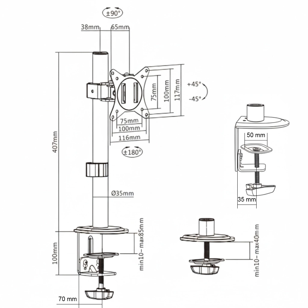 - Sugerowana grubość biurka: Zacisk: 10 ~ 85 mm Przelotka: 10 ~ 40 mm