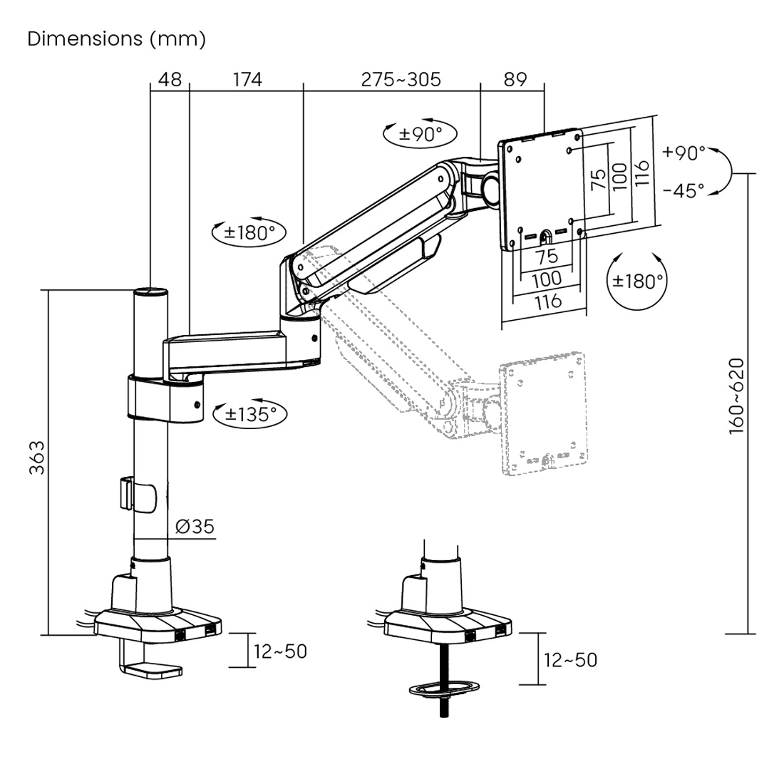 - Sprężynowy mechanizm równoważenia: Dostosowuje się do wagi monitora w zakresie 2–12 kg.