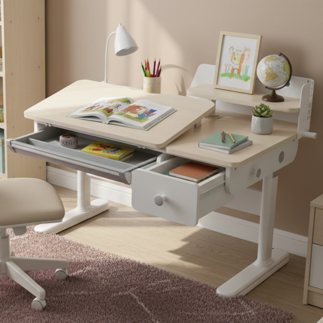 Wysuwana szuflada ułatwia przechowywanie zeszytów, notatek i drobnych przyborów szkolnych. Dzięki temu dziecko ma potrzebne rzeczy blisko, a na blacie zostaje więcej miejsca do pracy.