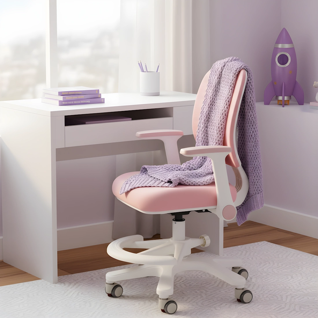 • Krzesło do biurka do dzieci Spacetronik SPC-XD-19. Fotel dziecięcy został wyposażony w 6 kółek, regulowane siedzisko z podłokietnikami. Ergonomiczny wybór do nauki i zabawy. Kolor różowy, regulowana wysokość 89-107 cm.