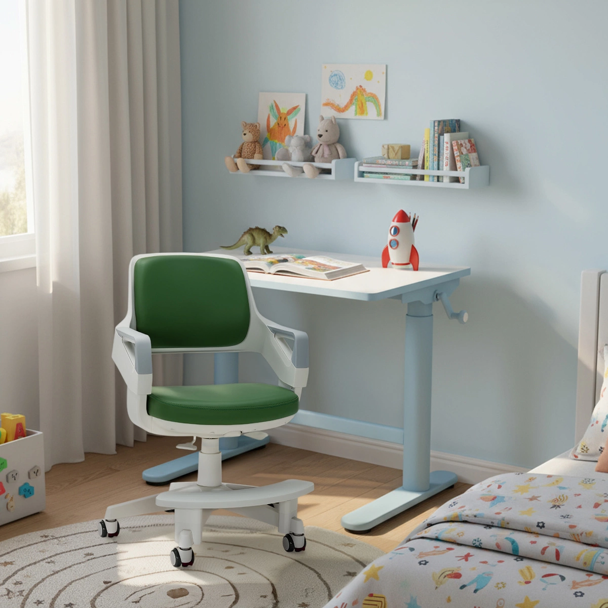 • Krzesło do biurka dla dzieci Spacetronik SPC-XD-09. Fotel dziecięcy został wyposażony w 5 grawitacyjnych kółek, regulowany podnóżek, oparcie i siedzisko z podłokietnikami. Ergonomiczny wybór do nauki i zabawy. Kolor zielony regulowana wysokość 81-97 cm.
