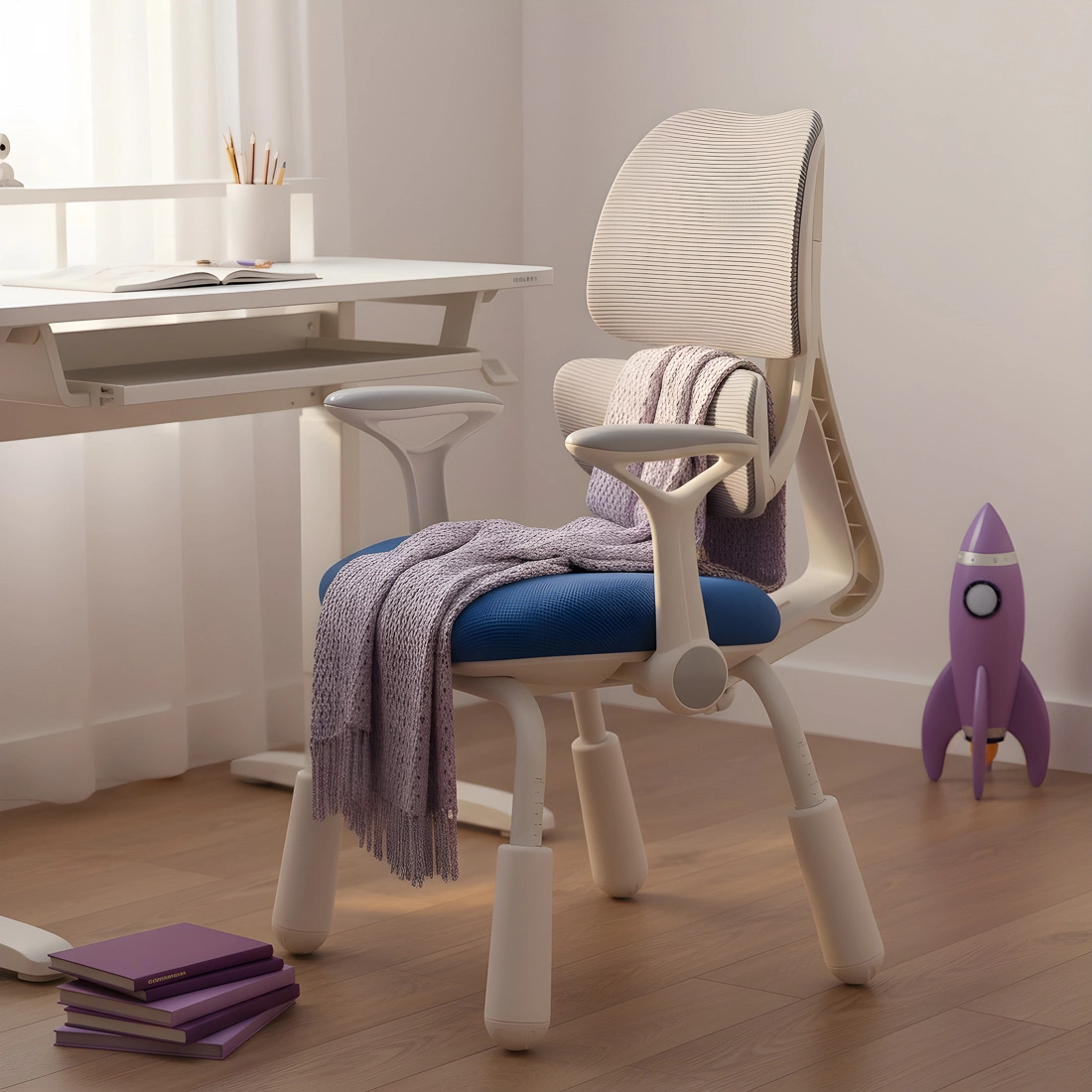 Krzesło posiada unikalne, dwuczęściowe i elastyczne oparcie, które dopasowuje się do naturalnego kształtu pleców, zapewniając podparcie na całej ich długości. Dodatkowo, wykonanie z przewiewnej siatki gwarantuje cyrkulację powietrza, co zapobiega przegrzewaniu się podczas dłuższej nauki.