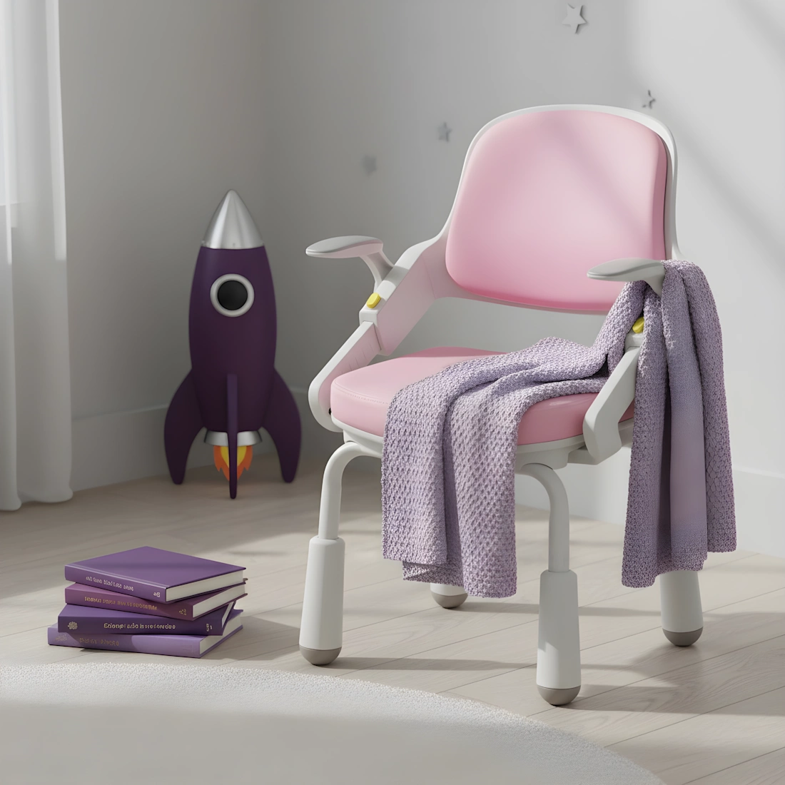 Wszystkie elementy wykonano z trwałych i bezpiecznych materiałów - od oparcia, przez solidną podstawę i ramę z wysokiej jakości tworzywa sztucznego. Zaokrąglone krawędzie, solidne nóżki i wygodne podłokietniki chronią Twoje dziecko podczas codziennego użytkowania.