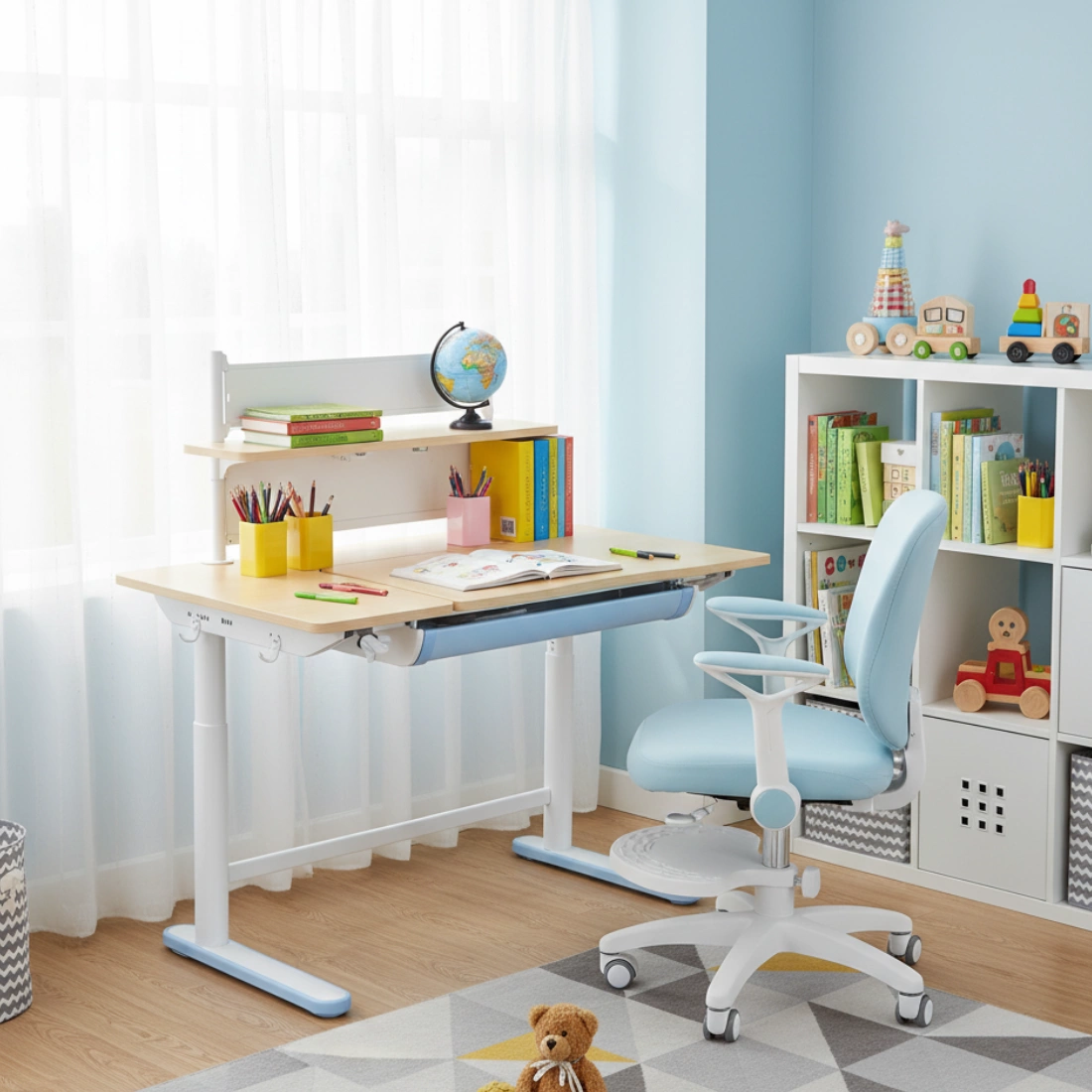 Po odrobieniu lekcji kompaktowa podstawa na kólkach pozwala latwo dosunac krzeslo pod blat, oszczedzajac miejsce. Elektrycznie regulowane biurko 55–89 cm ulatwia dopasowanie wysokosci do dziecka, a dodatkowa pólka zwalnia przestrzen na blacie. Cicha praca napedu (<50 dB) nie rozprasza. Polaczenie bialo-niebieskiego biurka i krzesla pasuje do róznych aranzacji i wprowadza swiezy, nowoczesny charakter.