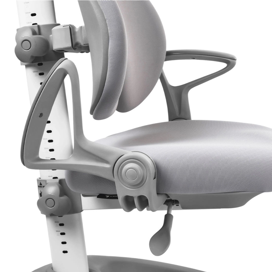 SPC-XD-05 zapewnia stabilna, dopasowana pozycje – podwojne oparcie z zakresem skretu na boki 0–45° i pochylu przód-tyl 0–65° lepiej podtrzymuje plecy. Regulowane podlokietniki (90°) ulatwiaja ukladanie rak i pozwalaja wsunac krzeslo glebiej pod blat po nauce. Kólka grawitacyjne blokuja sie, gdy dziecko siedzi (mozliwosc wylaczenia blokady), dzieki czemu ograniczaja niechciane ruchy. Wymiary siedziska 45 × 41 cm oraz szerokosc oparcia 45 cm (pojedynczy segment 22 cm, wysokosc 40 cm) gwarantuja wygode na co dzien.