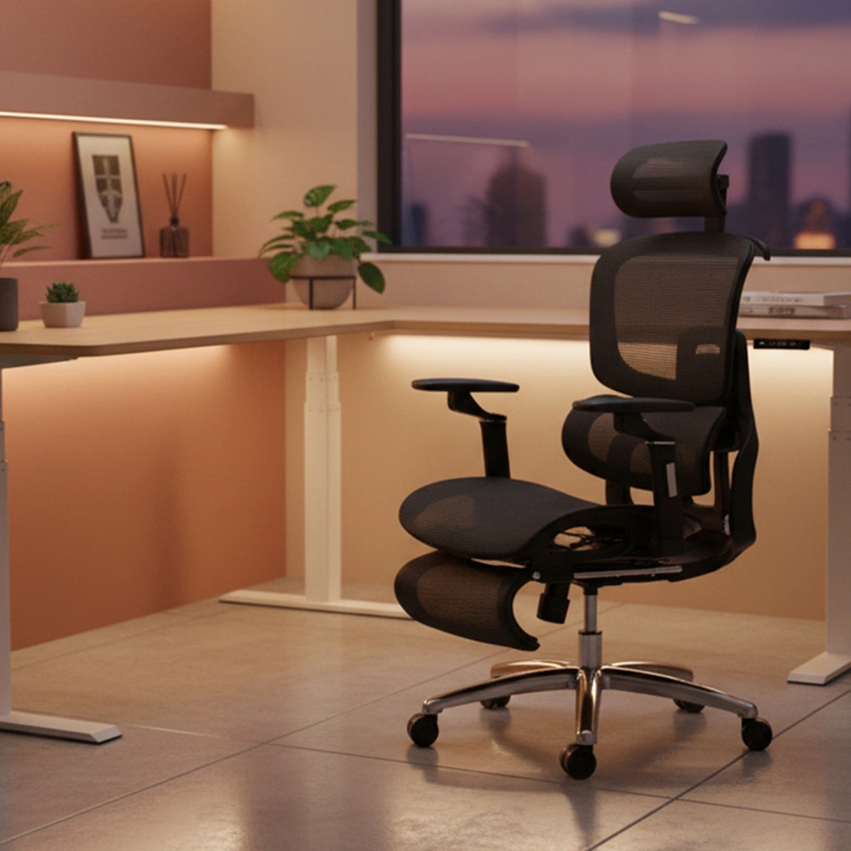 Fotel do biura Spacetronik DORIS 20 w swojej budowie zawiera wiele elementów, które możesz swobodnie regulować. Zagłówek 3D (góra-dół, odchył do tyłu całości i odchył do tyłu końcówki zagłówka). Podłokietniki 5D (przód-tył, góra-dół, obrót wokół osi, obrót wokół osi przesuniętej, odchylenie do tyłu) czy też wysuwany podnóżek. Do tego możliwość regulacji wysokości oparcia (składającego się z 2 części) i siedziska. Jednak to nie wszystko. Ustawić możesz również głębokość wentylowanego siedziska, a o Twoje plecy zadba również automatyczna poduszka lędźwiowa wyposażona w masażer. Wszystko po to, by zapewnić Ci jak najbardziej komfortowe doświadczenie podczas długich godzin przed biurkiem.