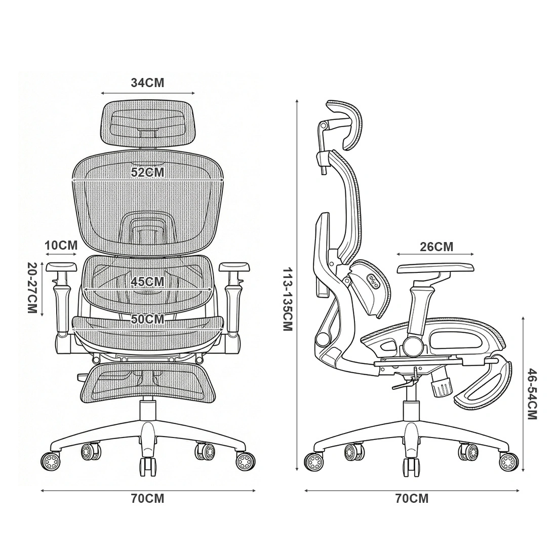 Zakres regulacji — 113-135 cm, szeroki zakres regulacji wysokości. Umożliwia precyzyjne dopasowanie krzesła do wzrostu użytkownika oraz wysokości biurka, zapewniając ergonomiczną i zdrową pozycję siedzenia.