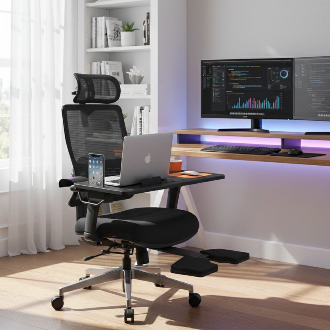 Kompletny duet do pracy, nauki i relaksu. Krzesło Spacetronik LUMBO 22 łączy automatyczne podparcie lędźwi, zagłówek 5D, podłokietniki 4D i wysuwany podnóżek. Nakładka SPC-LUMBO tworzy stabilny, regulowany pulpit na laptopa z uchwytami na tablet, telefon i kubek. Ergonomia + mobilność – gdziekolwiek pracujesz.