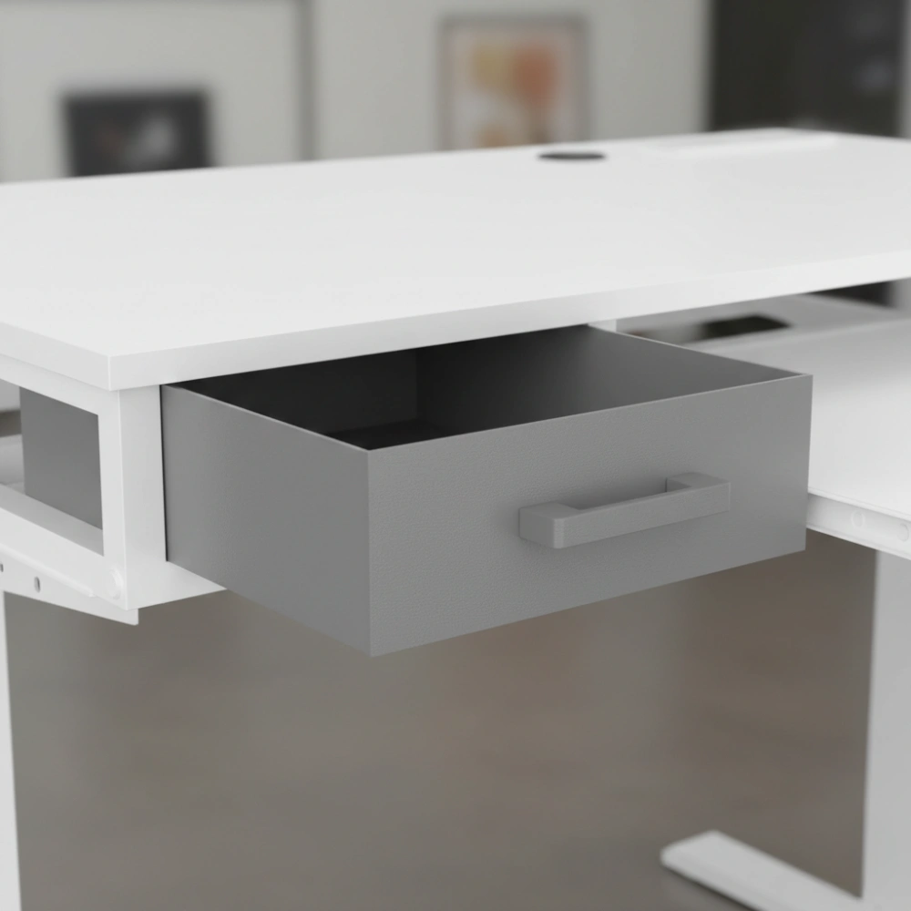 Wbudowana szuflada pod blatem pomaga uporządkować przestrzeń roboczą: schowasz w niej dokumenty, długopisy, notatniki czy dysk zewnętrzny. System soft-close sprawia, że domykanie jest płynne i ciche — bez trzaskania i bez irytujących dźwięków.