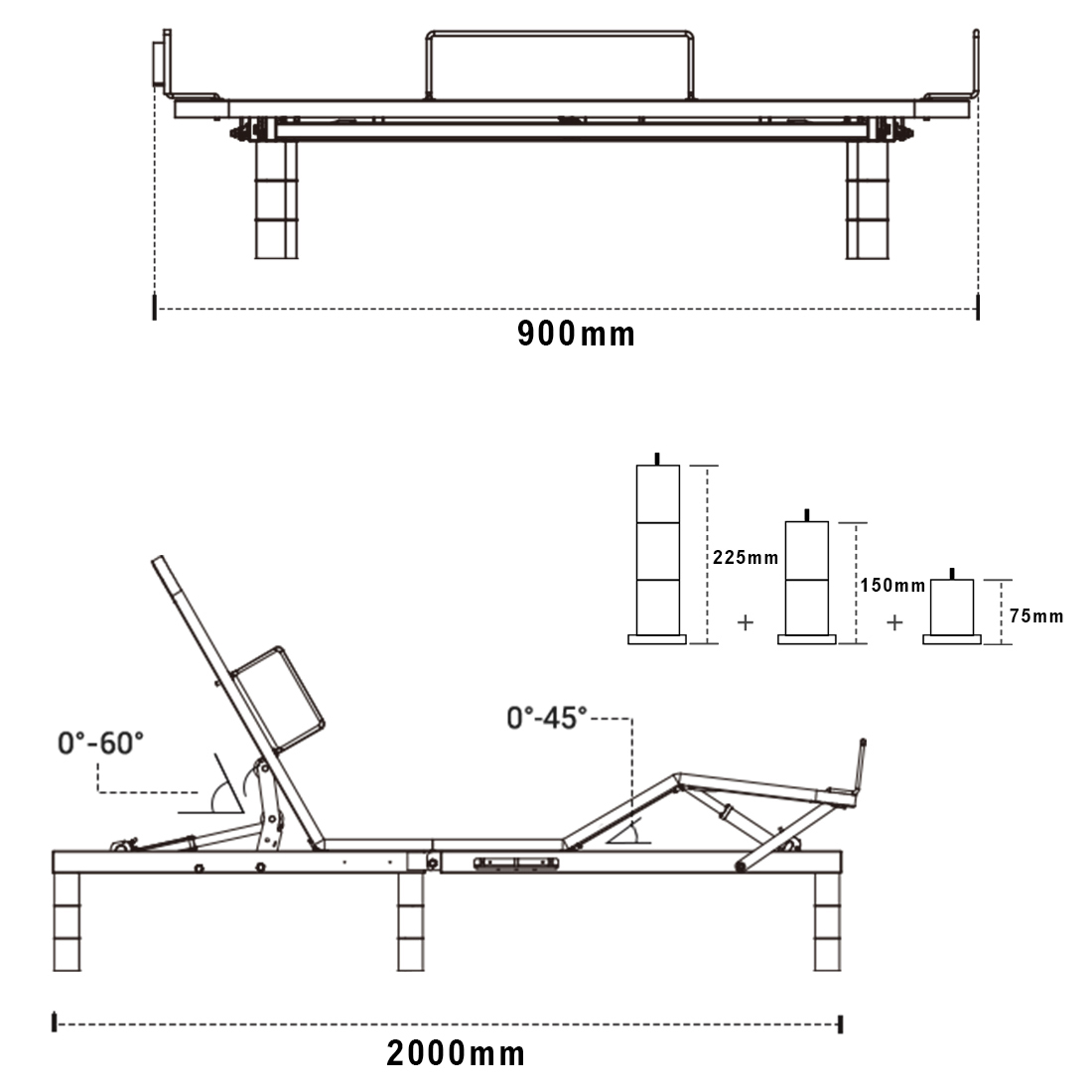 Regulowane łóżko Spacetronik może być używane jako samodzielny system nośny lub zostać zainstalowane do standardowej ramy łóżka bez stelaża z listew. Nowoczesne łóżko elektryczne Dozee zostało wyposażone w 6 modułowych nóg, które pozwalają uzyskać trzy różne wysokości łóżka - 7,5cm, 15cm lub 22,5cm (odległość od podłogi do spodu ramy). Przestrzeń pod łóżkiem, zwłaszcza w najwyższym możliwym ustawieniu może służyć jako schowek. Nóżki są gwintowane, co pozwala na zamontowanie kółek (brak w zestawie).