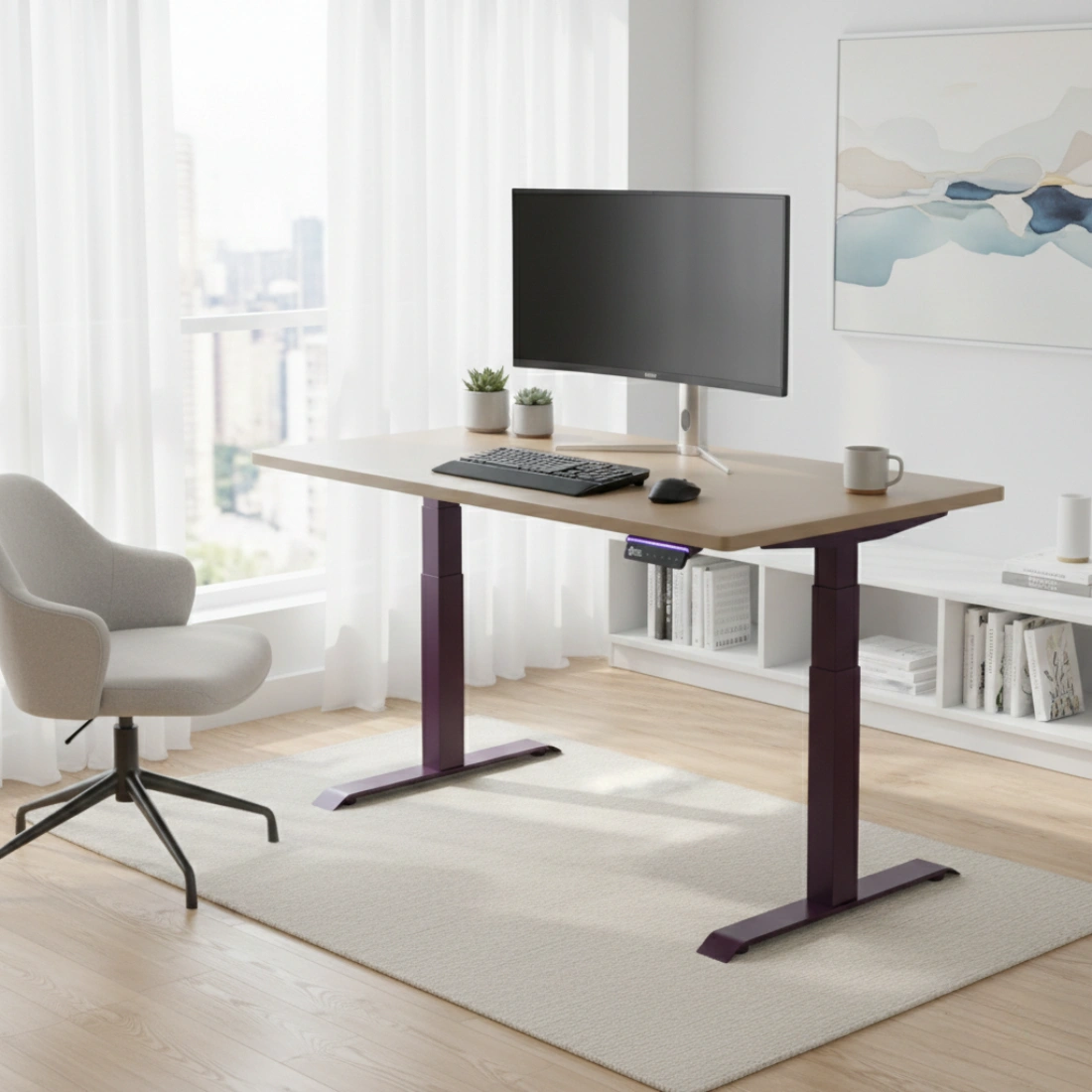 Połączenie elektrycznego stelaża o wysokiej stabilności z blatem MDF premium tworzy praktyczne biurko do intensywnej pracy. Wygodna regulacja wysokości, funkcje kontrolera i trwała powierzchnia blatu sprawiają, że to rozwiązanie dobrze sprawdza się zarówno w domu, jak i w biurze. To komplet z serii Vegard, stworzony z myślą o komforcie i długiej żywotności.