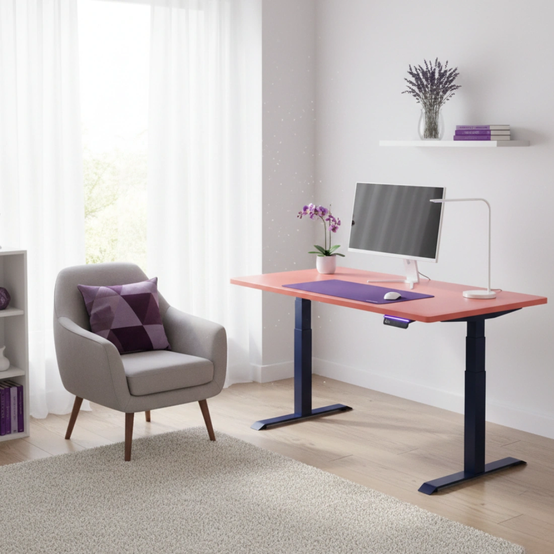 • Ergonomiczne biurko do pracy siedzącej i stojącej: dwusilnikowy stelaż z kontrolerem OLED RGB, pamięcią ustawień i systemem antykolizyjnym oraz blat MDF premium malowany proszkowo – trwały, higieniczny i łatwy w czyszczeniu.