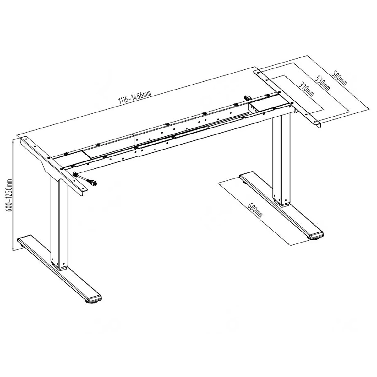 Wszechstronna rama elektrycznego stelaża oprócz regulacji góra/dół pozwala na ręczną regulację horyzontalną (w bok). W łatwy sposób rozszerzysz konstrukcję pod wymiar swojego blatu. Sugerowane wymiary blatu: 1200-1800 mm (szerokość), 600-800 mm (głębokość).