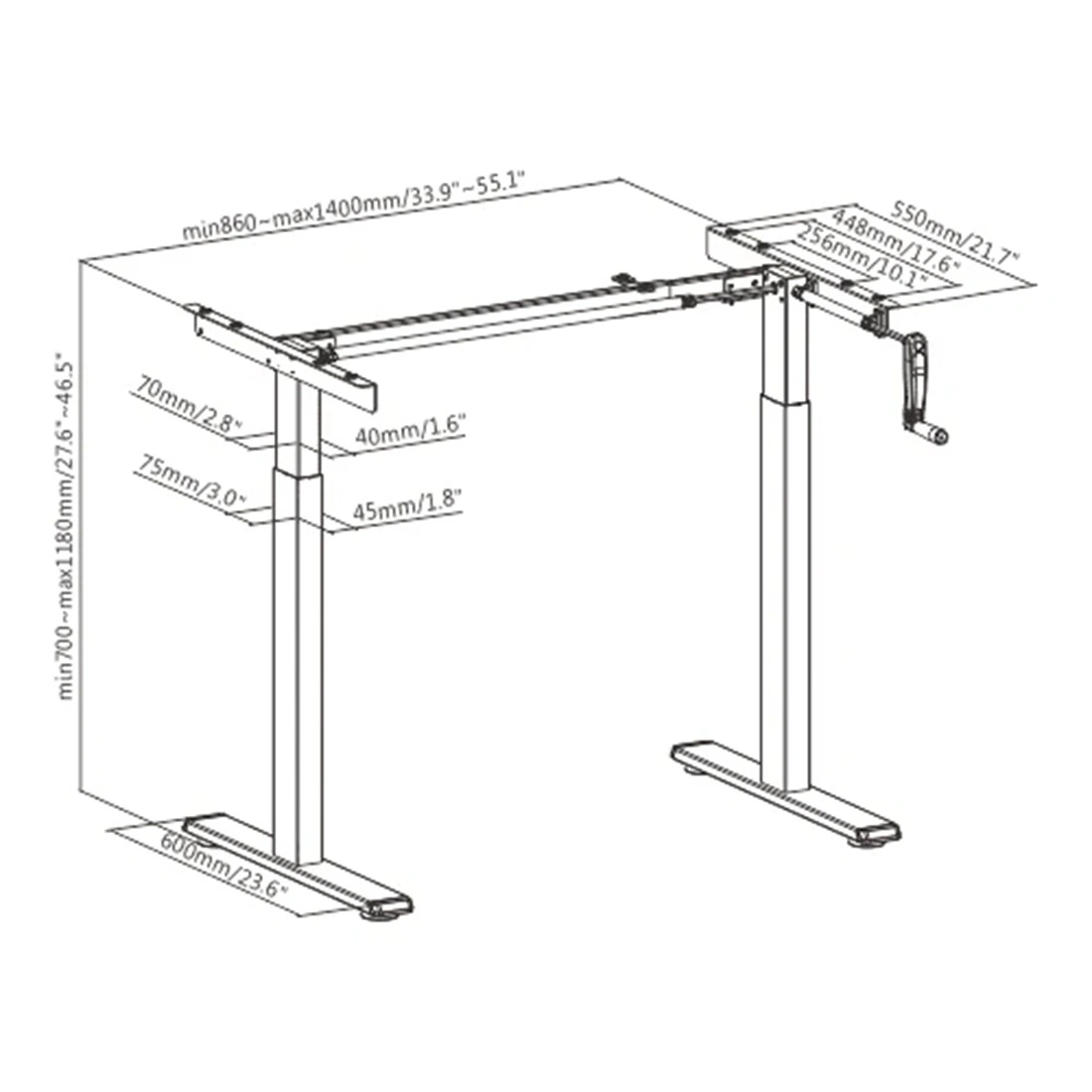 Manualna regulacja wysokości – wygodna korbka umożliwia płynną zmianę wysokości biurka bez użycia prądu