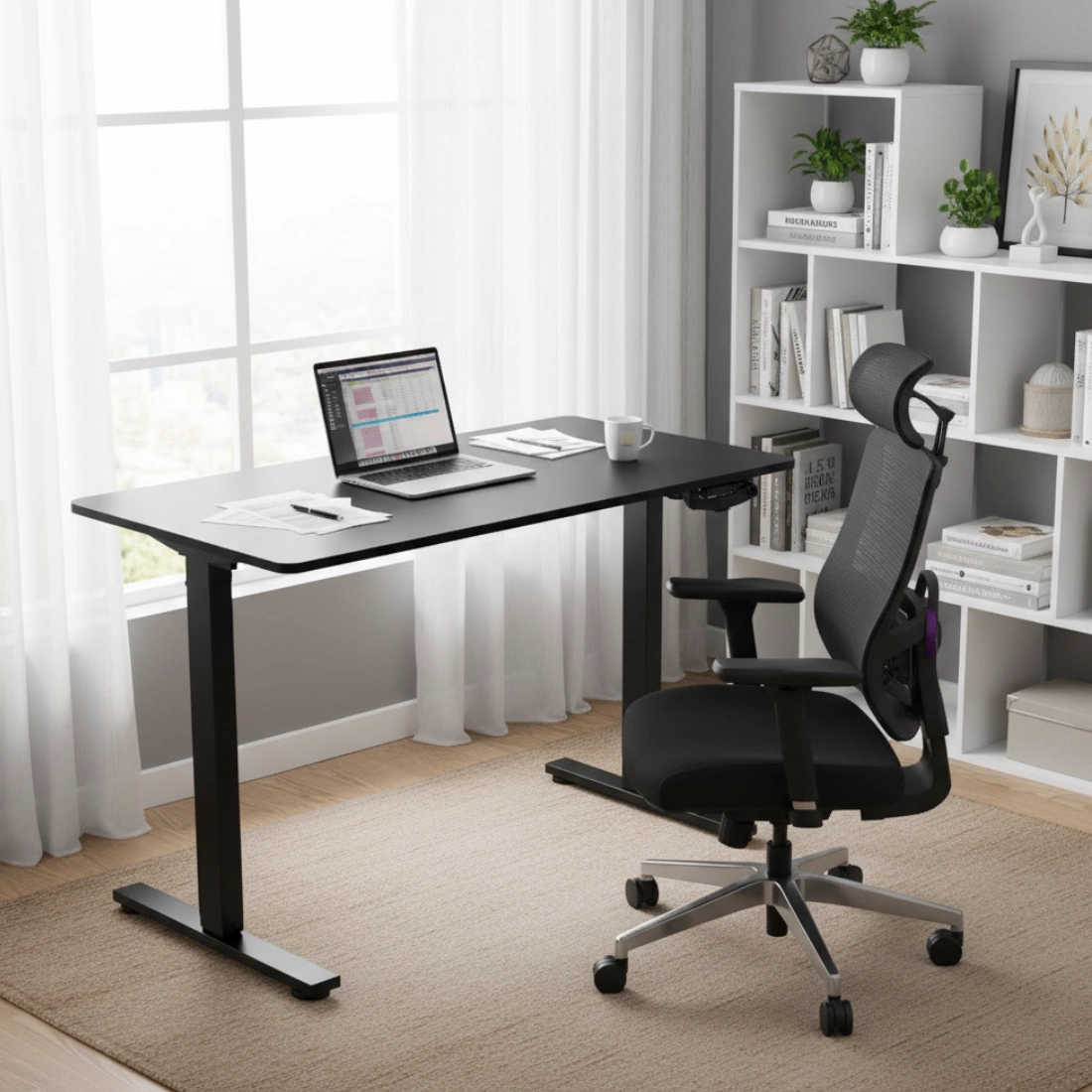 Kompletny duet do zdrowej pracy: fotel z automatycznym wsparciem lędźwiowym, podłokietnikami 4D, zagłówkiem 5D i wysuwanym podnóżkiem + manualne biurko z regulacją wysokości 72–109,5 cm i blatem 100×60 cm. Pracuj wygodnie na siedząco i na stojąco, zachowując świetną wentylację (siatka MESH) i stabilność konstrukcji.