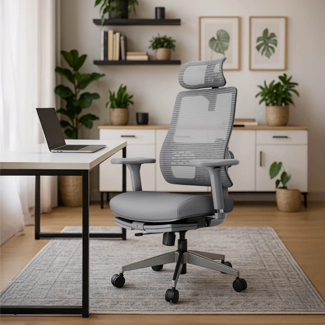 Kompletny duet do zdrowej pracy i nauki: fotel z automatycznym wsparciem lędźwi, podłokietnikami 4D, zagłówkiem 5D oraz wysuwanym podnóżkiem + manualne biurko z regulacją 72–109,5 cm i kompaktowym blatem 100×60 cm. Oddychająca siatka MESH w krześle i stabilna, stalowa konstrukcja biurka tworzą komfortowe stanowisko w domu i biurze.