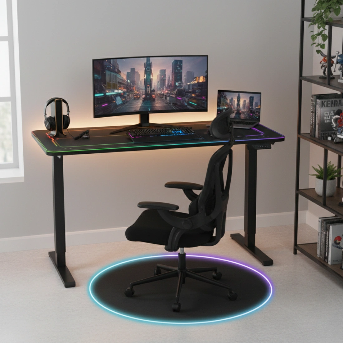 Zestaw sprawdzi się w pokoju gracza, domowym biurze i przy stanowisku do streamingu. Biurko zapewnia szybkie dopasowanie wysokości i efektowny wygląd dzięki RGB, krzesło DORIS 11 wspiera plecy i pozwala ustawić wygodną pozycję na długie godziny, a mata SPB047_RGB chroni podłogę oraz dodaje efektowną poświatę RGB pod stanowiskiem. To komfort, który czuć od pierwszego dnia — i funkcje, które realnie ułatwiają codzienne korzystanie ze stanowiska.