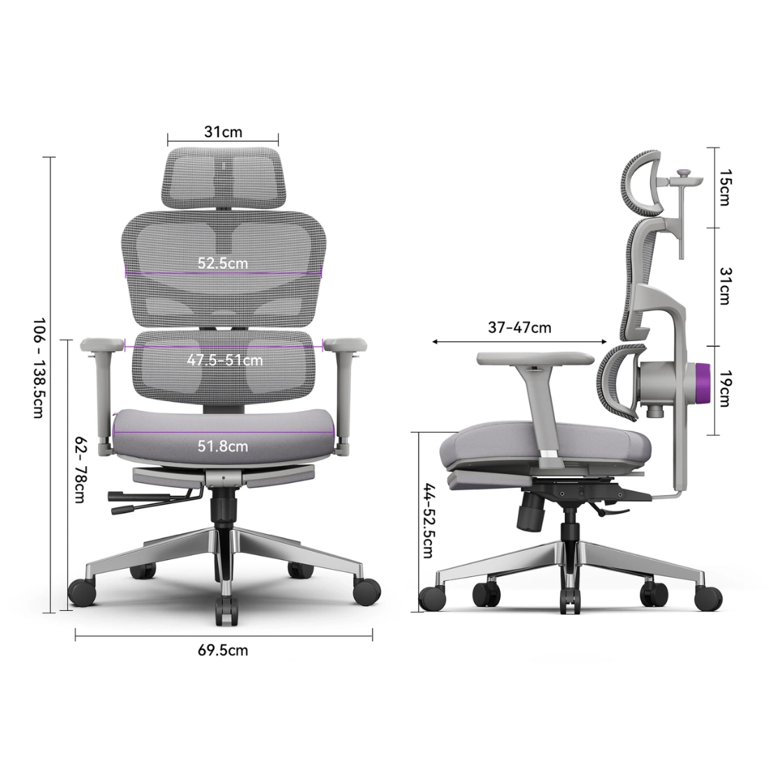 Fotel posiada zagłówek 2D, podłokietniki 4D, pochył oparcia 96°–136°, regulowaną głębokość siedziska oraz wysuwany podnóżek.