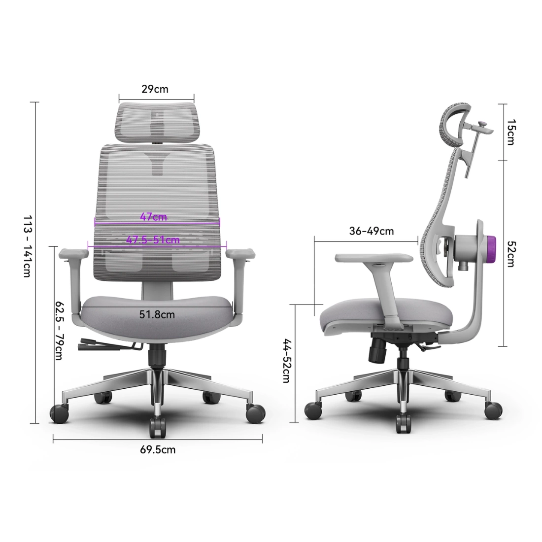 Automatyczne lędźwie, zagłówek 5D i podłokietniki 4D – dopasuj fotel do sylwetki i stylu pracy.