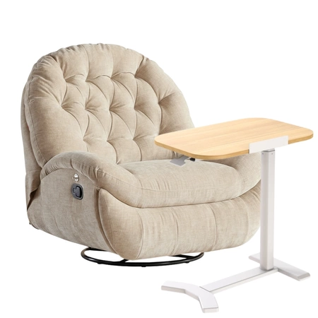 Komfortowy duet do relaksu i pracy: beżowy fotel Flax 04M z potrójnym systemem relaksu (manualna regulacja oparcia i podnóżka, kołyska Glider, obrót 360°) oraz mobilny stolik BUDDY 18 z gazową regulacją wysokości, pochylanym blatem 60×40 cm i kółkami ukrytymi w podstawie. Wszystko, czego potrzebujesz, by usiąść, odchylić oparcie i wygodnie ustawić laptop lub książkę.