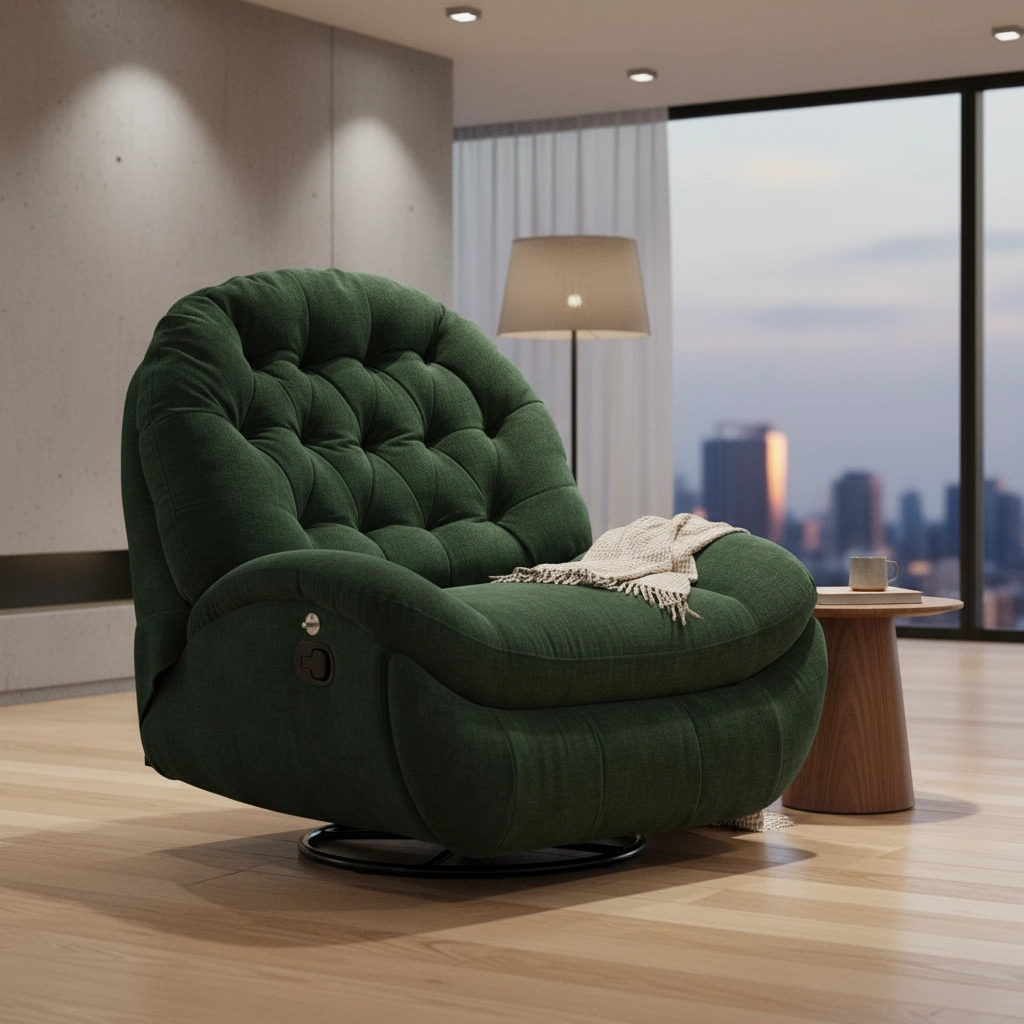 Grube pikowania i pianka 30 kg/m³ otulają ciało, a mechanizm kołyski, obrót 360° i manualna regulacja oparcia z podnóżkiem pozwalają szybko znaleźć idealną pozycję. Uchwyt na telefon i kieszeń boczna ułatwiają organizację.