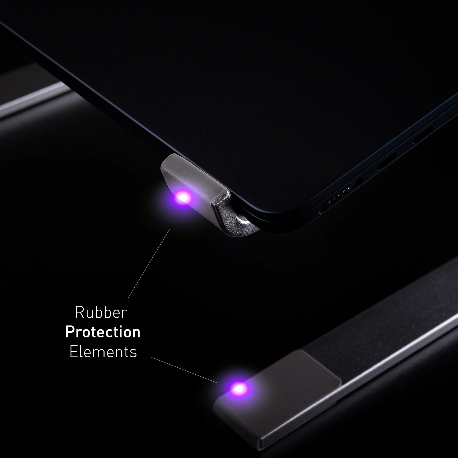Podstawka została wyposażona w gumowane podkładki w newralgicznych miejscach. Tym samym zabezpieczając przed porysowaniem nie tylko biurko, ale również samo urządzenie.