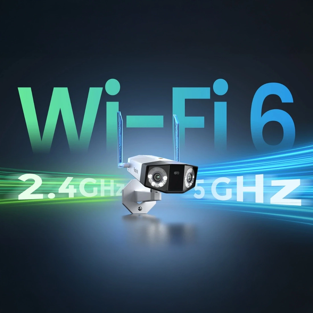 Kamera Reolink Duo 3 WiFi obsługuje technologię Wi-Fi 6 w dwóch pasmach – 2,4 GHz i 5 GHz. Dzięki temu zyskujesz stabilne połączenie w całym domu oraz błyskawiczny transfer danych, który gwarantuje płynny podgląd obrazu w jakości 16 MP Ultra HD.