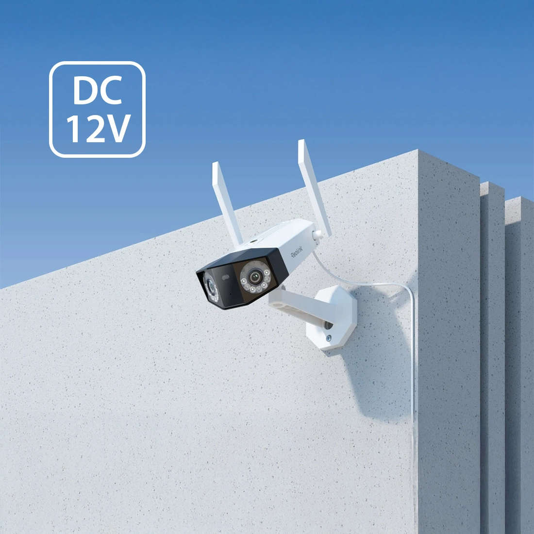 Kamera Reolink Duo 3 WiFi zasilana jest przewodowo poprzez DC 12 V ⎓ 2 A. To stabilne rozwiązanie, które gwarantuje nieprzerwaną ochronę 24/7 bez konieczności ładowania akumulatora. Podłącz i zapomnij o przerwach w monitoringu – kamera pracuje bez przerwy w dzień i w nocy.