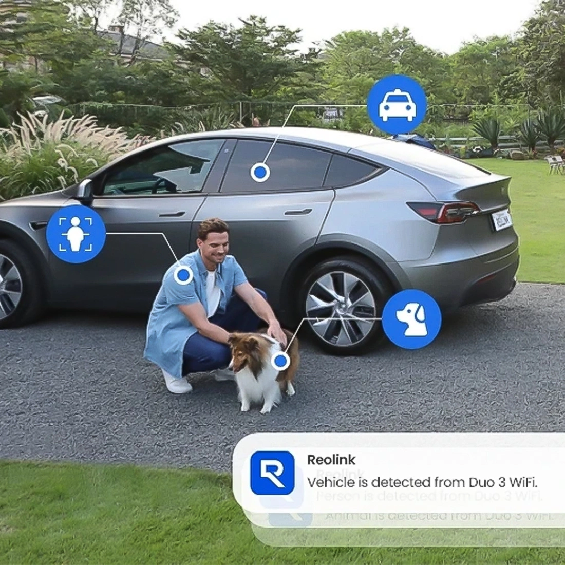 Kamera Reolink Duo 3 WiFi analizuje obraz i precyzyjnie rozpoznaje osoby, pojazdy i zwierzęta. Dzięki temu dostajesz tylko istotne powiadomienia – bez fałszywych alarmów wywołanych np. przez gałęzie czy cień.