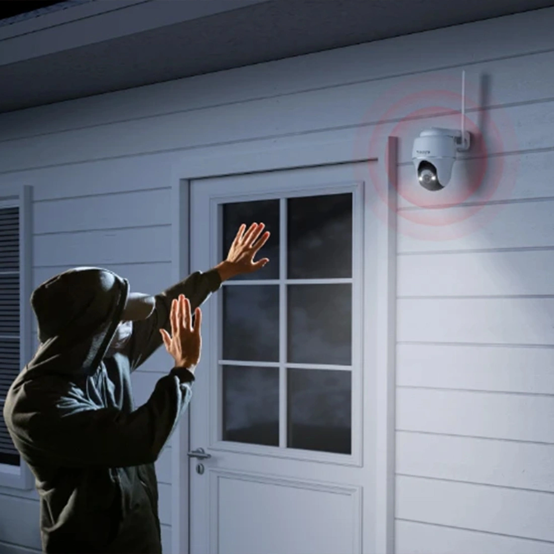 Kamera ma wbudowany mikrofon i głośnik, więc możesz nie tylko słyszeć to, co dzieje się w pobliżu, ale też od razu zareagować. Jednym dotknięciem w aplikacji powiesz kurierowi, gdzie zostawić paczkę albo poprosisz nieproszone osoby o opuszczenie terenu. Dodatkowo kamera oferuje podwójne ostrzeganie dźwiękiem i światłem. Głośna syrena i rozbłysk reflektorów LED skutecznie zniechęcają potencjalnych intruzów jeszcze zanim wyrządzą szkody.