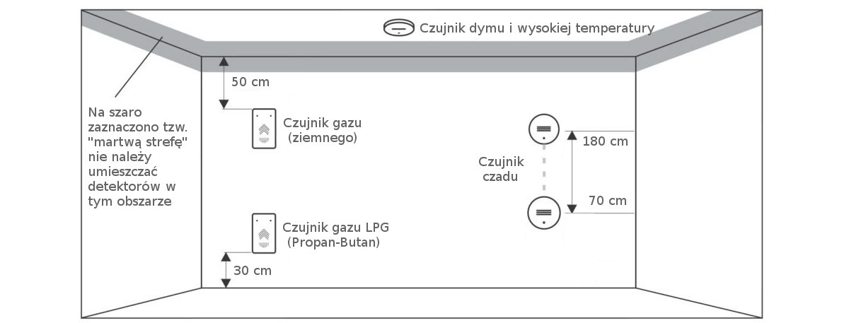 - czujnik dymu i wysokiej temperatury - montaż na suficie (najlepiej w centralnym punkcie pomieszczenia)