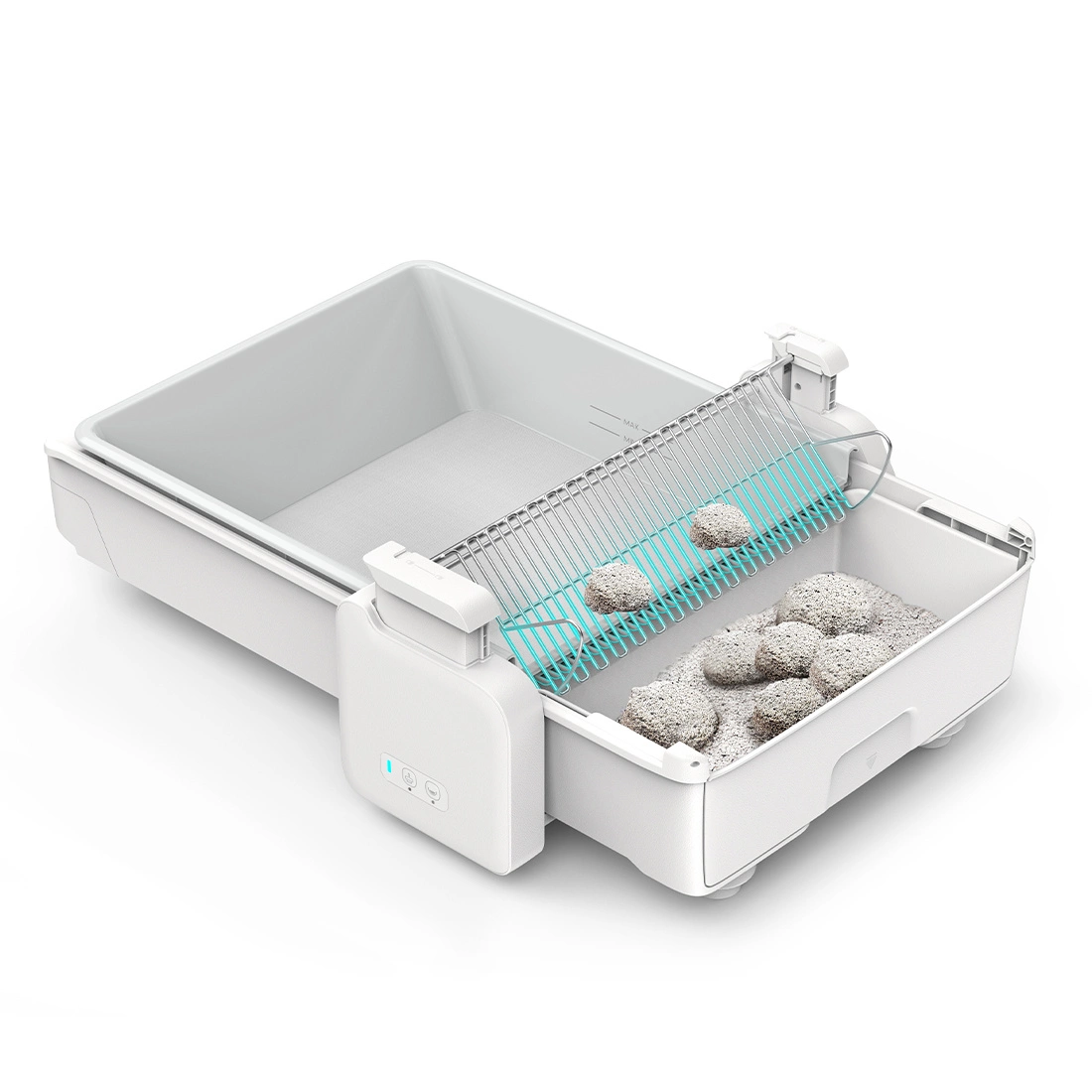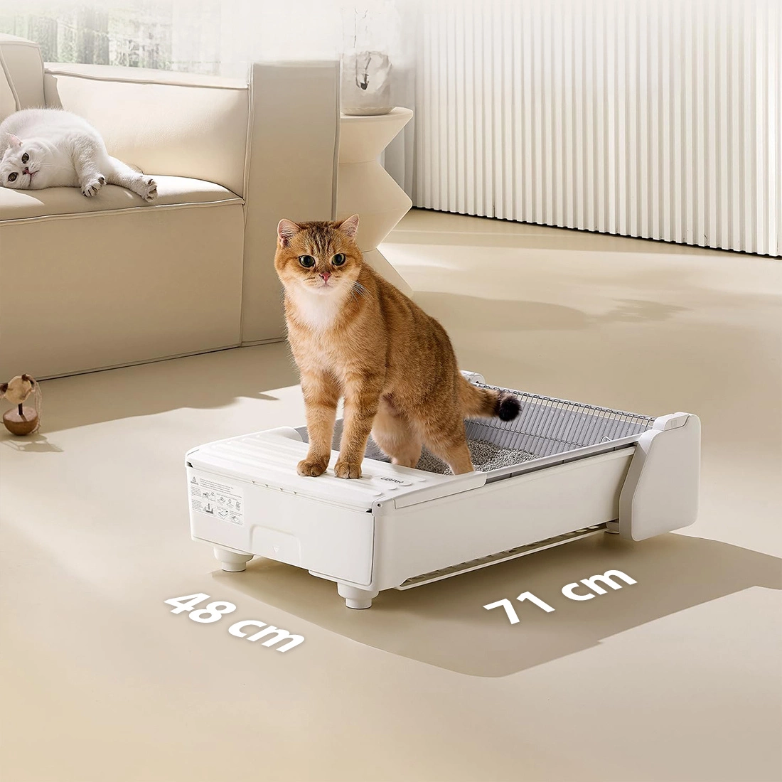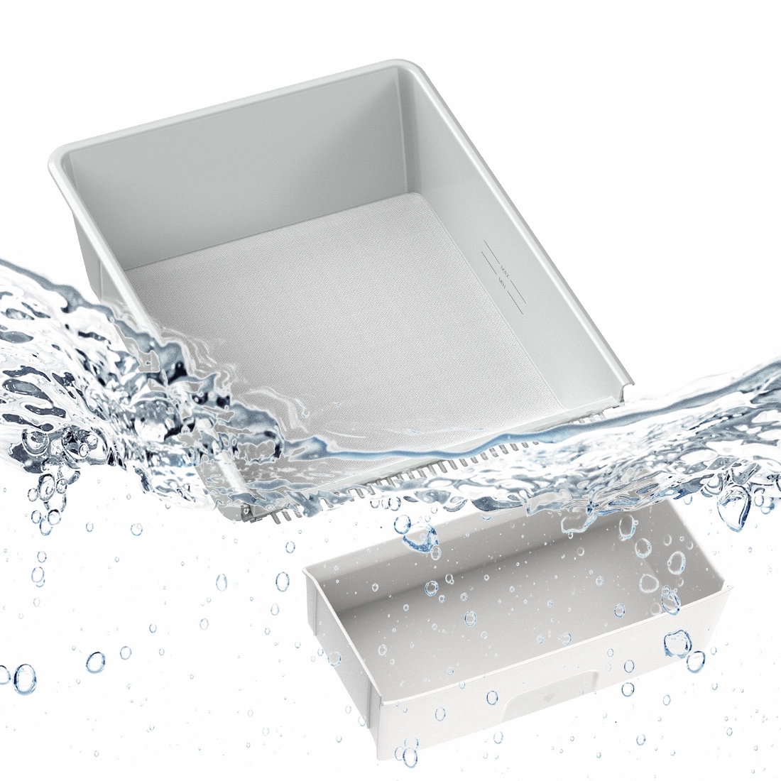 Konstrukcja jest modułowa, więc rozłożysz ją w kilku krokach. Metalowy zgarniacz, tackę i kosz na odpady można wyjąć i opłukać pod wodą. Dno kuwety pokryto powłoką antyprzyczepną, która ogranicza przywieranie resztek i przyspiesza sprzątanie. To idealne rozwiązanie dla osób ceniących higienę i wygodę.