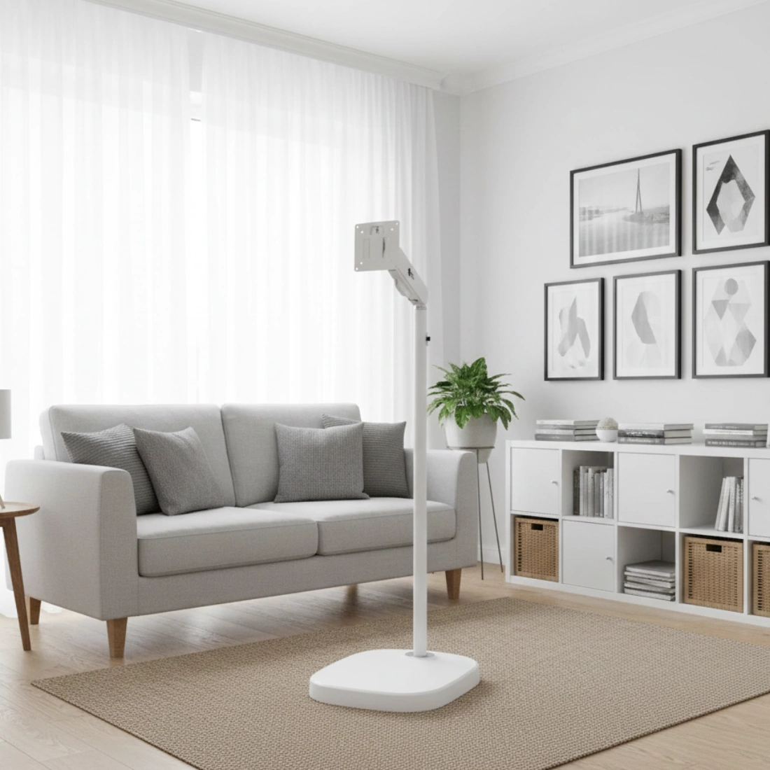 Stabilna, prostokątna podstawa o wymiarach 40 × 36,5 cm z kółkami umożliwia swobodne przemieszczanie stanowiska — od biurka po salę konferencyjną i salon. Jedno urządzenie, wiele zastosowań.