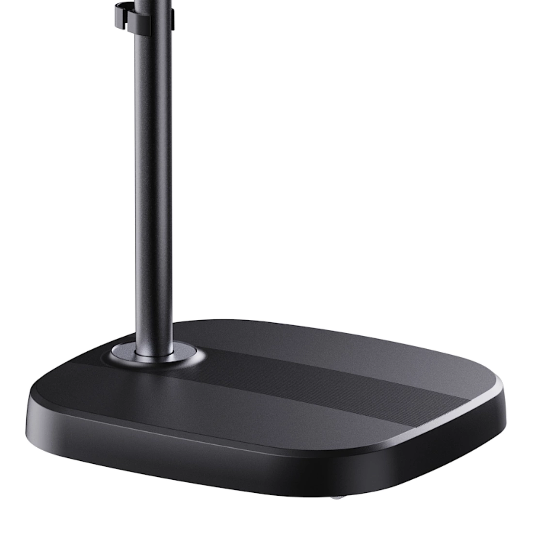 Wyobraź sobie stanowisko, które podąża za Tobą. Stabilna, prostokątna podstawa o wymiarach 40 × 36,5 cm na kółkach pozwala jednym ruchem przenieść monitor tam, gdzie go potrzebujesz — do pracy, nauki lub rozrywki. Aluminiowa konstrukcja dba o bezpieczeństwo sprzętu.