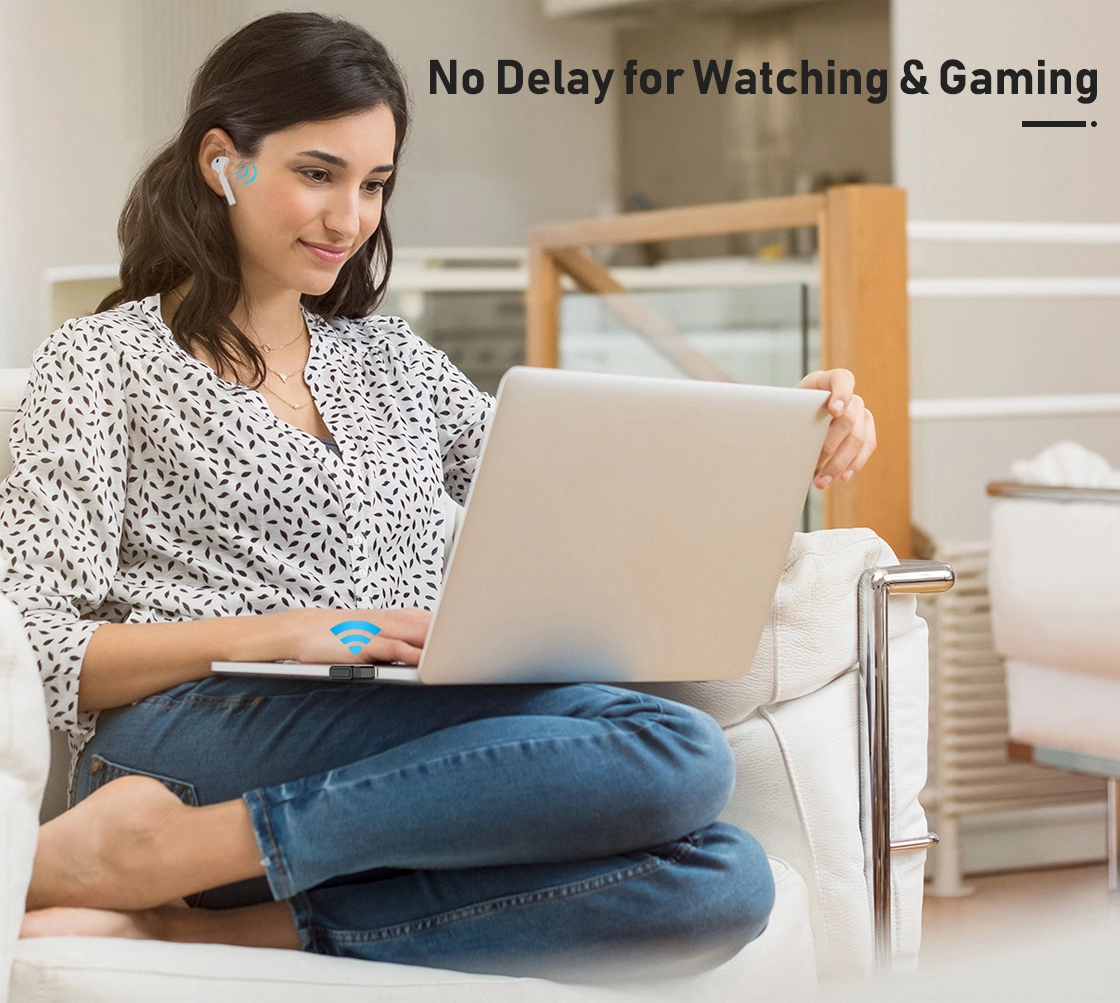 Wyposażony w technologię Bluetooth 5.0 nadajnik USB Bluetooth zapewnia użytkownikom komputerów PC wydajne połączenie bezprzewodowe, zmniejszając problem częstego zrywania połączenia. Dzięki wbudowanej antenie zasięg transmisji dźwięku może obejmować do 10-20 m na otwartych przestrzeniach.