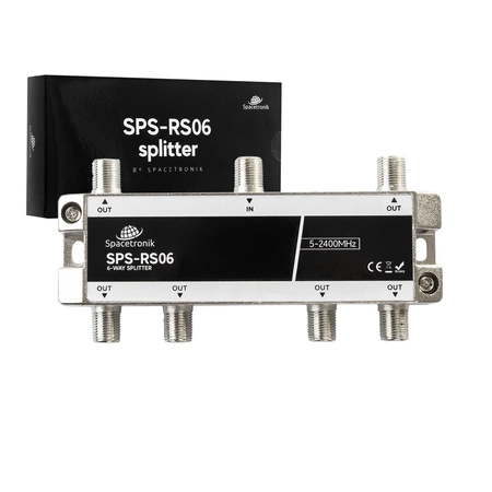 Wysokiej jakości małostratny ekranowany splitter, (rozgałęźnik sygnału telewizyjnego), posiadający 1 wejście i 6 wyjść. Spacetronik SPS-RS06 pracuje w zakresie 5-2400 MHz. Wszystkie porty: Złącza typu "F".