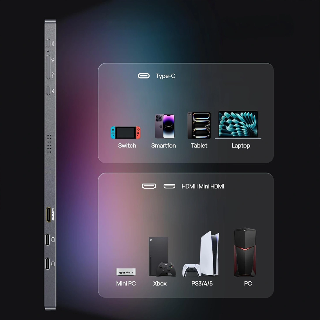 Do dyspozycji masz dwa porty USB-C oraz mini HDMI 2.0. Dzięki temu monitor bez problemu współpracuje także ze starszymi laptopami, komputerami stacjonarnymi oraz konsolami. Drugi port USB-C pozwala zasilać monitor z ładowarki lub powerbanku, bez obciążania laptopa.