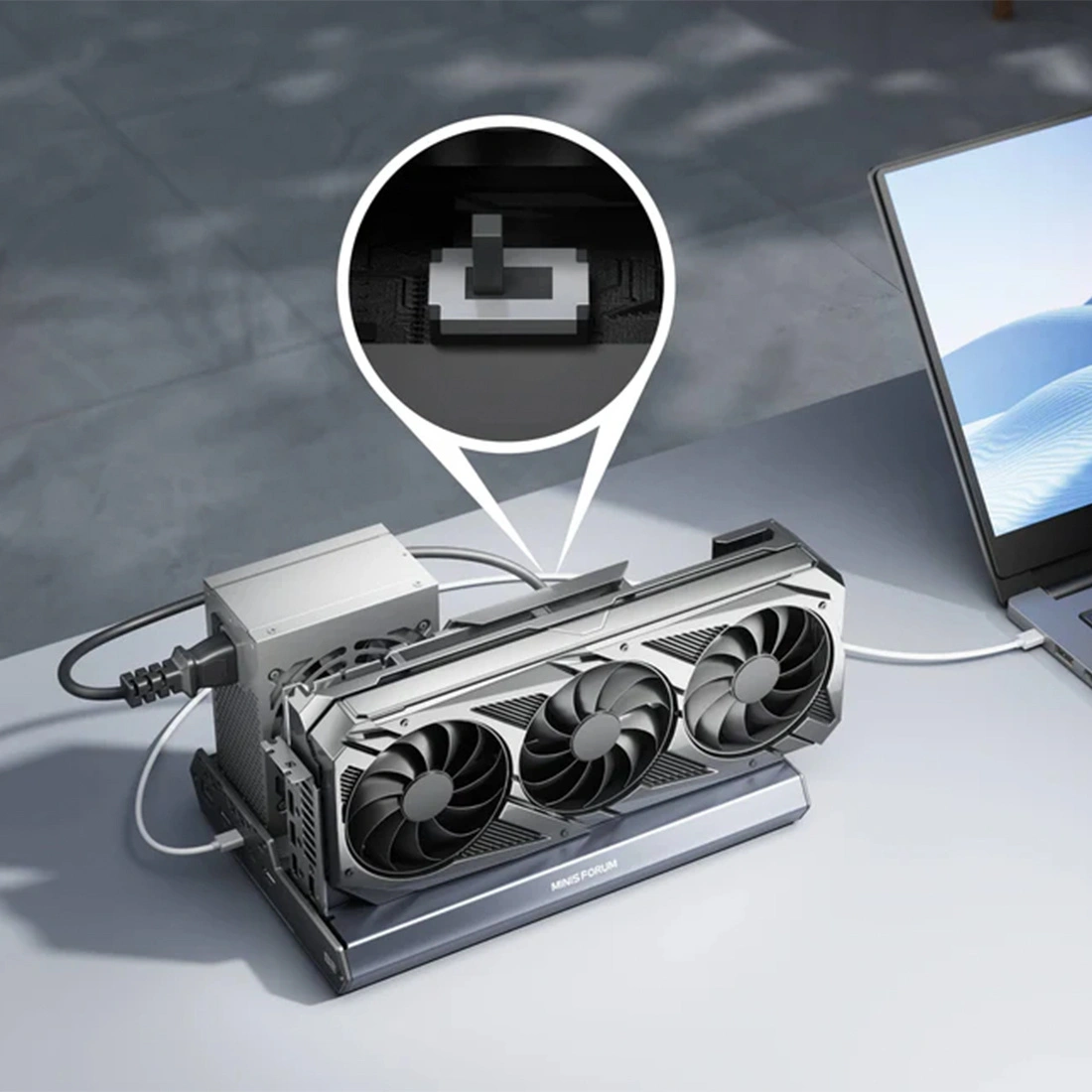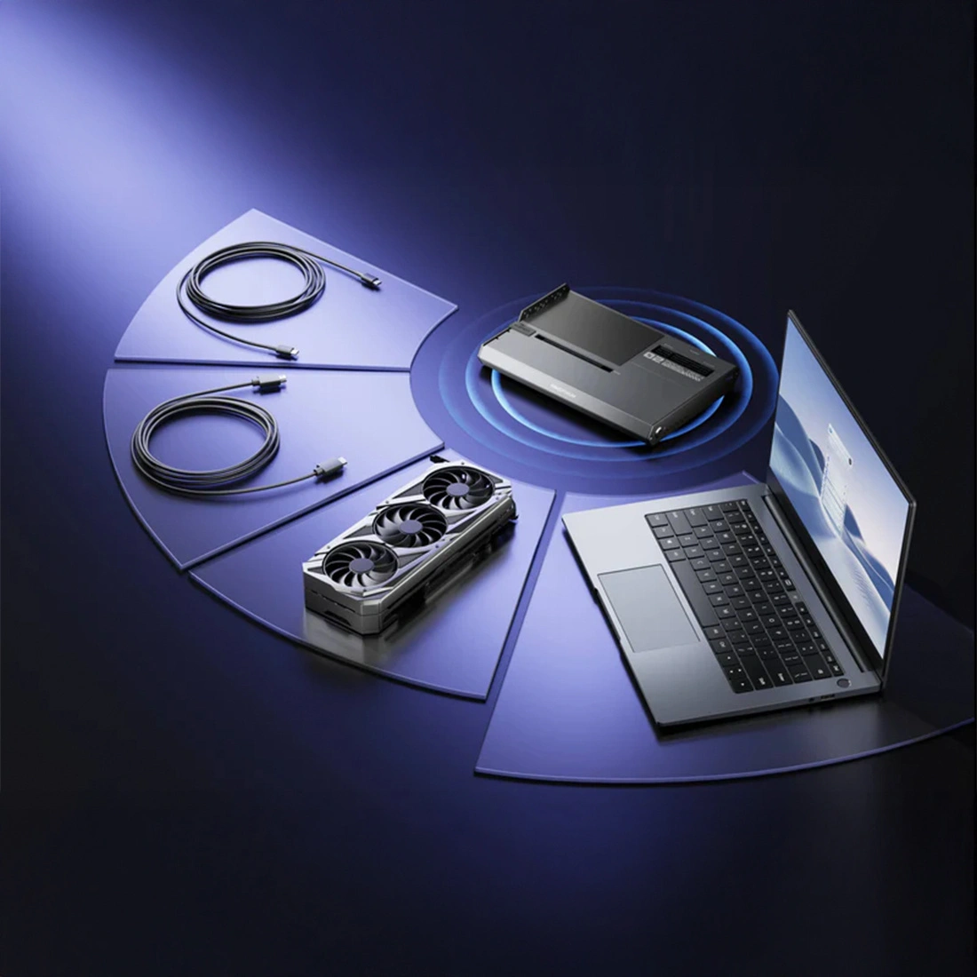 Minisforum DEG2 umożliwia korzystanie z jednej, pełnowymiarowej karty graficznej na kilku komputerach jednocześnie. GPU pozostaje na biurku, stale podłączone i gotowe do pracy, niezależnie od tego, czy używasz ultrabooka, mini PC czy stacji roboczej. Po podpięciu jednego kabla natychmiast odzyskujesz pełną wydajność GPU klasy desktop, bez przenoszenia sprzętu i bez ponownej konfiguracji systemu.
