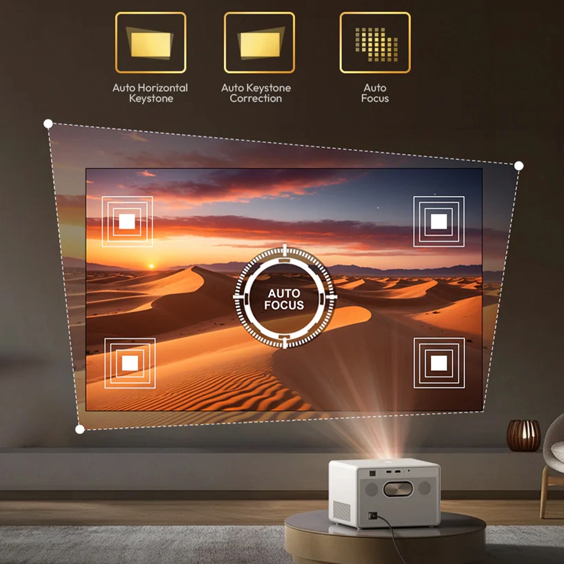BYINTEK PLATO T5 Max został wyposażony w autofokus oraz automatyczną korekcję trapezu w pionie i poziomie, dzięki czemu obraz po uruchomieniu jest od razu ostry i prosty. Projektor sam koryguje zniekształcenia do ±45°, a w razie potrzeby możesz ręcznie dopasować także narożniki. To duża wygoda, szczególnie gdy często zmieniasz miejsce projekcji lub korzystasz z sufitu.