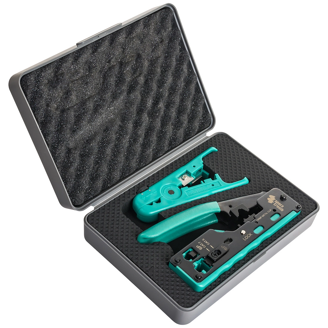 Wysokiej jakości narzędzie - zaciskarka Spacetronik PT-CT02 do wtyczek przelotowych RJ to niezbędne narzędzie każdego instalatora, który ma na co dzień kontakt z sieciami teleinformatycznymi oraz telekomunikacyjnymi. Narzędzie przeznaczone do zaciskania wtyków RJ45 8P8C (zarówno przelotowych, jak i standardowych) oraz standardowych RJ11 (6P4C), RJ12 (6P6C). Dodatkowo w narzędzie wbudowany został zaciskacz ekranów. Specjalny mechanizm dociskowy uniemożliwia niedostateczny docisk złącz. Spacetronik PT-CT02 posiada blokadę, która zapobiega przed niepożądanym otwarcie narzędzia. Elementy robocze wykonane są z metalowego odlewu, uchwyt otoczony osłoną z tworzywa sztucznego zapewnia pewny chwyt narzędzia podczas pracy.