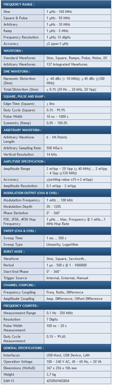 Na szczególną uwagę zasługują dwa równoważne kanały wyjściowe, duża liczba zapisanych arbitralnych przebiegów i wiele rodzajów modulacji. Kształt fali jest wyświetlany graficznie na kolorowym wyświetlaczu TFT, który pokazuje wybrany element z wytycznymi, takimi jak ustawienie częstotliwości, okres, amplituda, przesunięcie, polaryzacja, kąt przesunięcia fazowego i różne typy modulacji. Oprócz funkcji przemiatania częstotliwości, funkcji impulsowania i modulacji, urządzenie to ma również 7-cyfrowy licznik częstotliwości o wysokich funkcjach pomiarowych odpowiednich dla częstotliwości do 350 MHz. Duża liczba funkcji i łatwość użytkowania tego urządzenia jest idealna dla prawie wszystkich zadań w zakresie badań, rozwoju i edukacji.