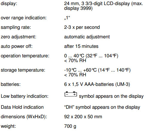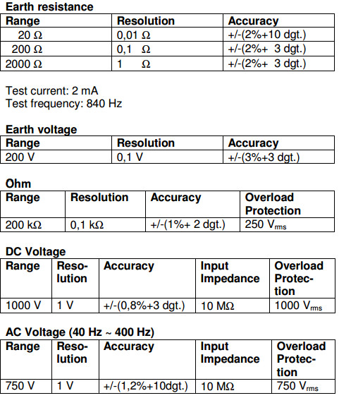 - Akcesoria: etui, przewody pomiarowe czerwony 15m, żółty 10m, zielony 5m,bateria, instrukcja.
