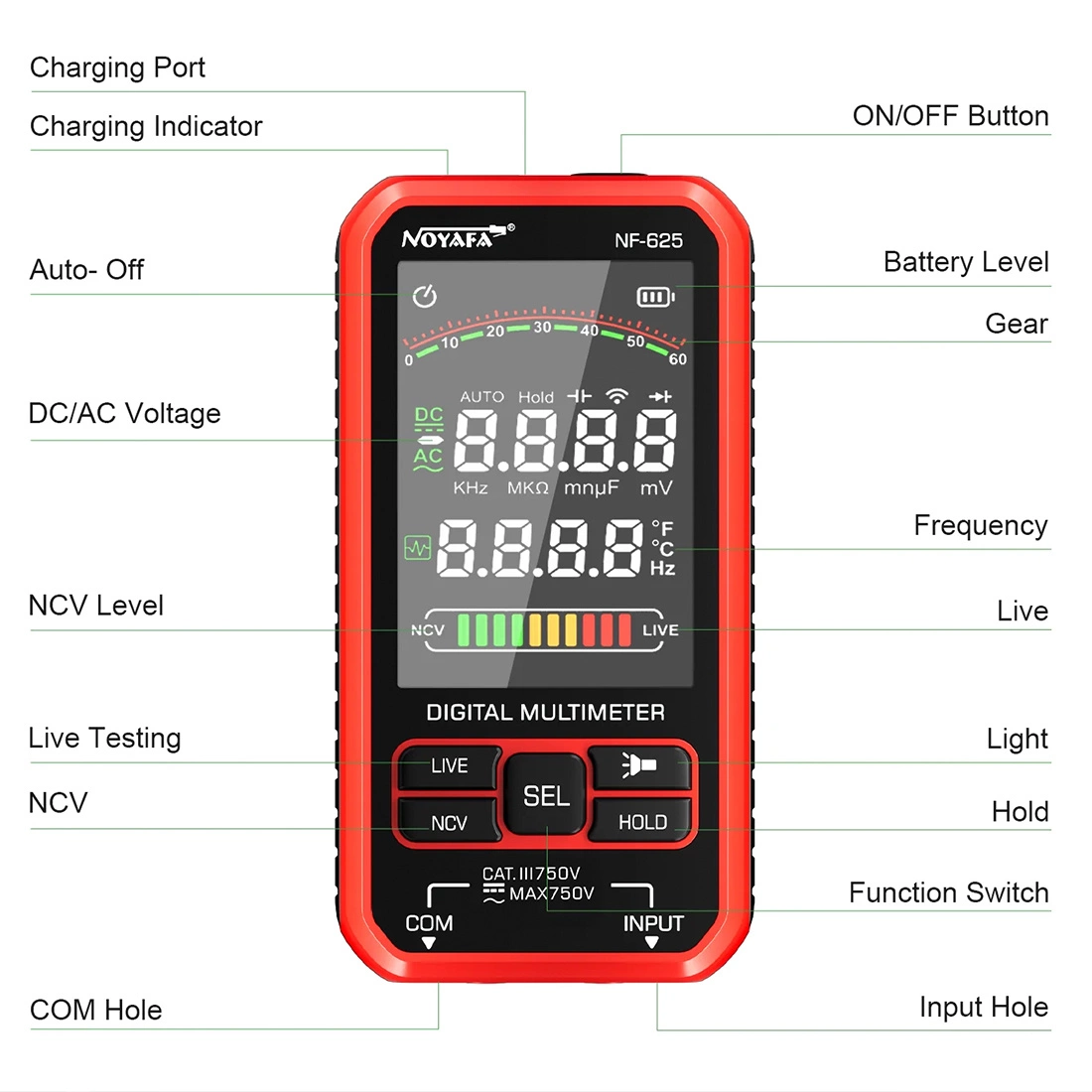 • Multimetr cyfrowy Noyafa NF-625 z automatycznym wyborem zakresu ułatwia pomiary napięcia AC/DC do 750 V, rezystancji, pojemności, częstotliwości i temperatury. Ma bezdotykowe NCV ze wskaźnikiem, duży ekran LCD z podświetleniem i akumulator USB-C.