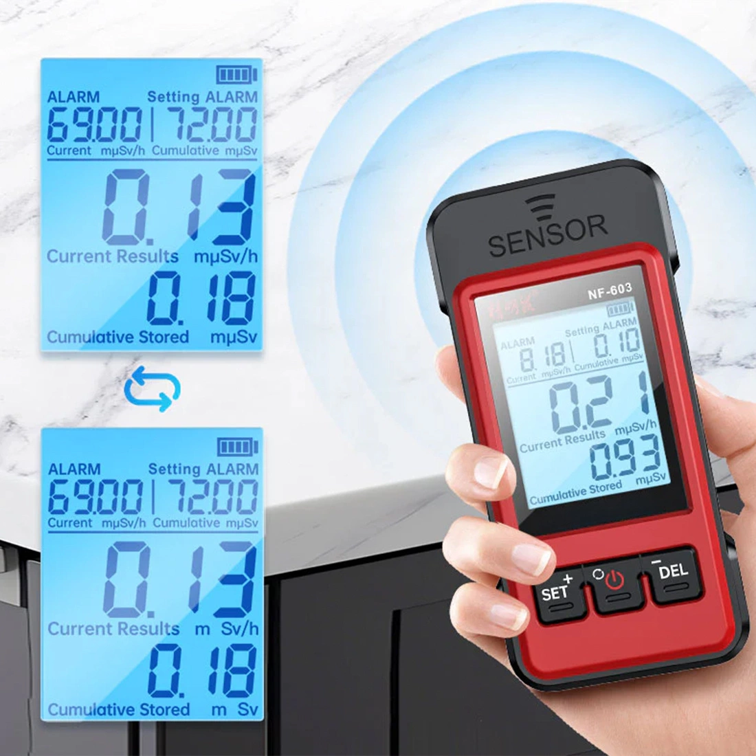 Nie musisz stale patrzeć na ekran. Ustawiasz własny próg alarmu, a NF-603 poinformuje Cię dźwiękiem, gdy promieniowanie przekroczy bezpieczny poziom. To praktyczna funkcja, szczególnie podczas pracy w terenie i nadzorze BHP.