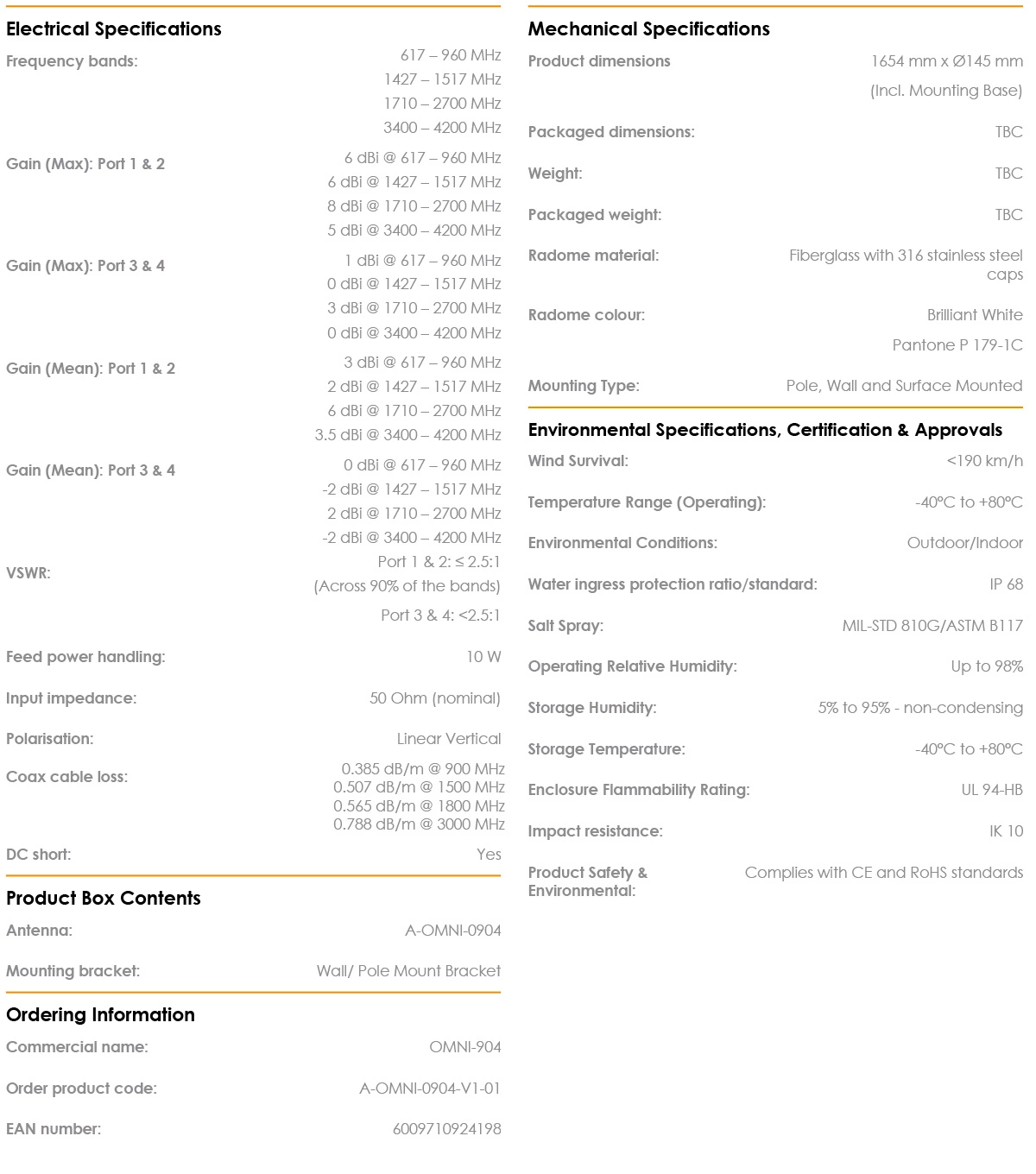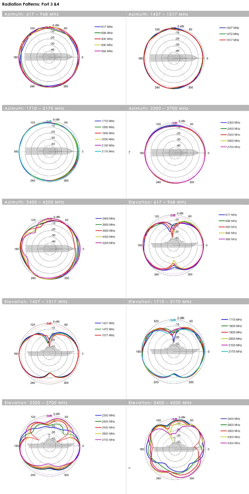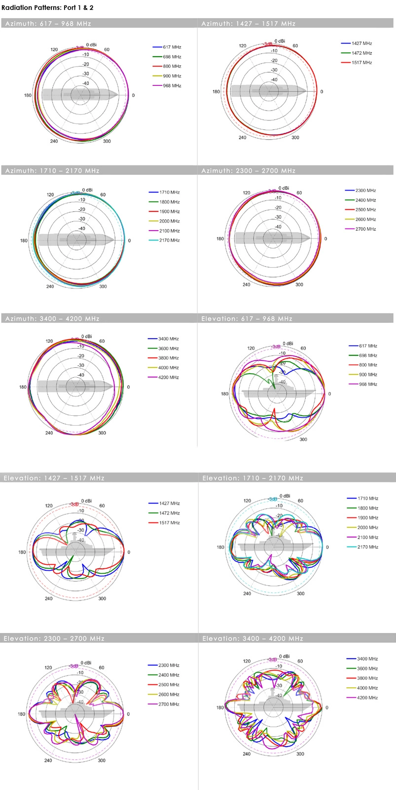 6 dBi @ 617–960 MHz 6 dBi @ 1427–1517 MHz 8 dBi @ 1710–2700 MHz 5 dBi @ 3400–4200 MHz |