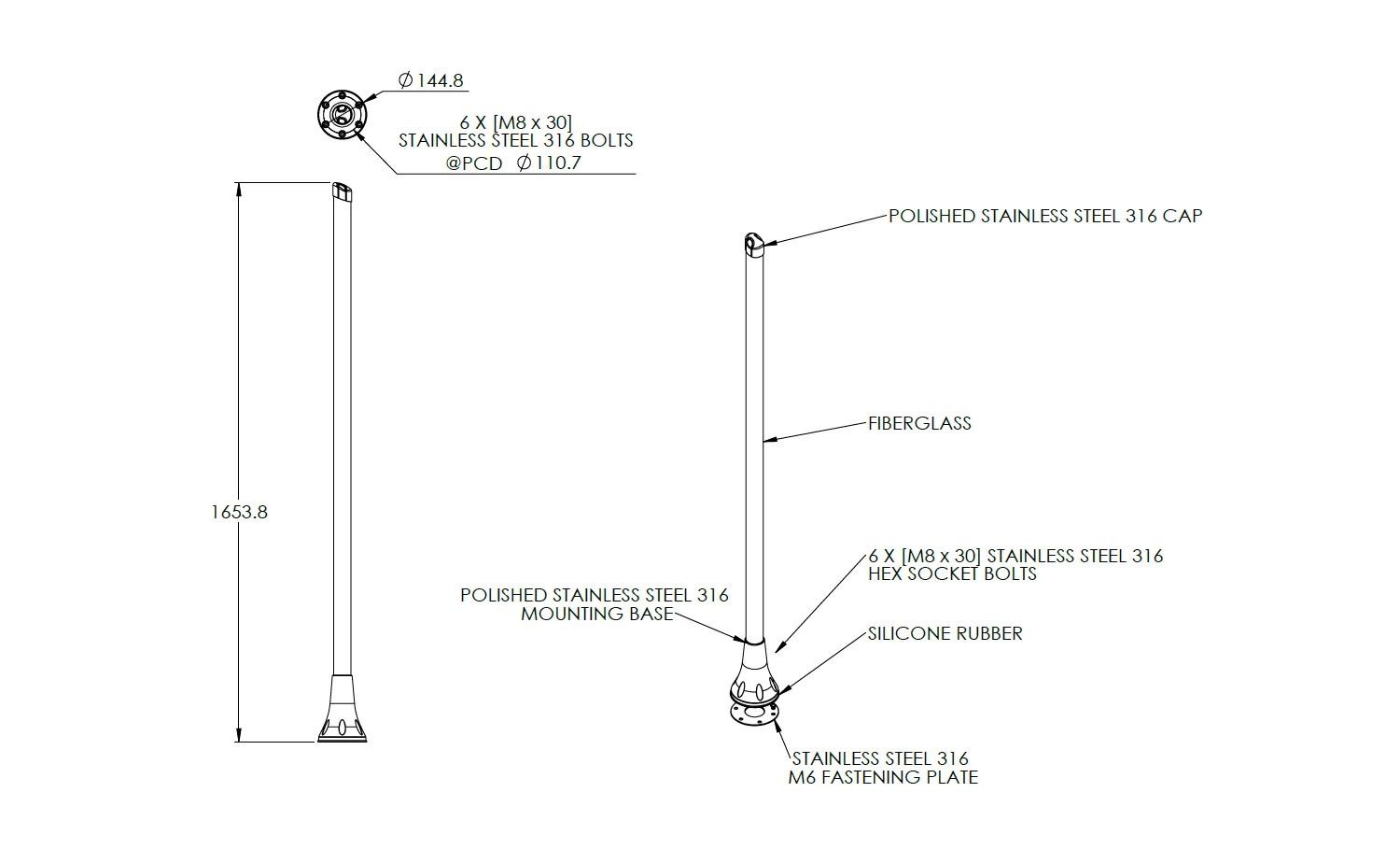 Obudowa z kompozytu fiberglass z końcówkami ze stali nierdzewnej 316 jest odporna na promieniowanie UV, sól i uderzenia (IK10). Uszczelnienie IP68 i testy mgły solnej (MIL-STD 810G / ASTM B117) zabezpieczają antenę w najbardziej korozyjnych warunkach.