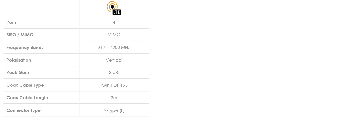 Antena OMNI-904 łączy w jednej obudowie cztery niezależne tory antenowe dla LTE/5G. Obsługuje wszystkie kluczowe pasma komórkowe w zakresie 617–4200 MHz, w tym Band 71 (617–698 MHz) oraz CBRS 3.4–4.2 GHz. Dzięki temu jest rozwiązaniem przyszłościowym, zapewniającym pewny sygnał w każdej lokalizacji.