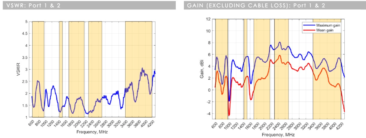3 dBi @ 617–960 MHz 2 dBi @ 1427–1517 MHz 6 dBi @ 1710–2700 MHz 3.5 dBi @ 3400–4200 MHz |