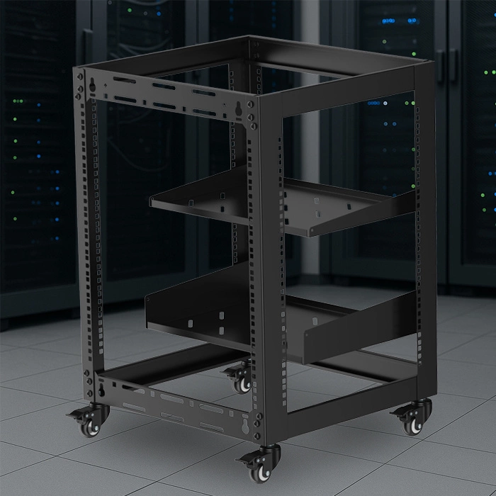 - Mobilność: 4 kółka z blokadą umożliwiają łatwe przestawianie otwartego stelaża serwerowego 19” w dowolne miejsce.